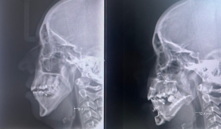 Dois meses após a cirurgia ortognática de avanço bimaxilar e mentoplastia, a paciente, inicialmente diagnosticada com síndrome de apneia do sono grave (102 apneias/h), repetiu a polissonografia, que agora revelou um índice ligeiro, apenas posicional (8 apneias/h). A paciente ficou satisfeita com o resultado estético, sem sintomas noturnos nem diurnos, e deixou de necessitar utilizar o CPAP.