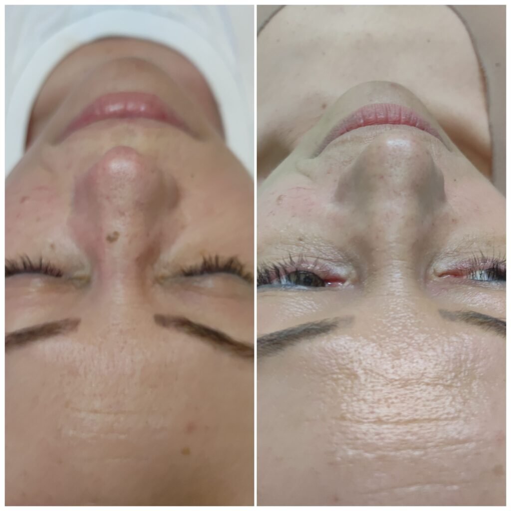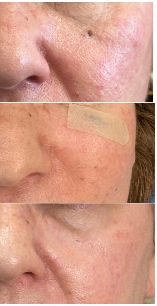 Exérese cirurgica de sinal da face. Pós-óp imeadito com pontos na pele e penso steri-strip. Resultado 1 mês depois sem cicatriz visível.